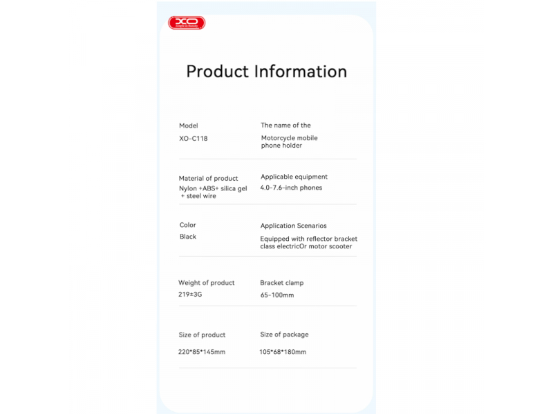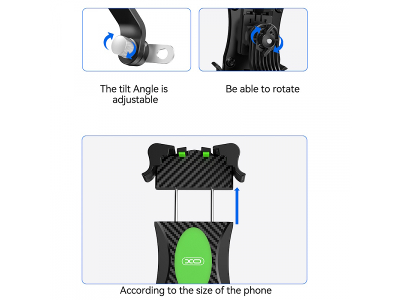 XO C118 ir universāls viedtālruņa turētājs, piemērots velosipēdiem un motocikliem. Īpašā konstrukcija droši notur viedtālruni stabilā stāvoklī.