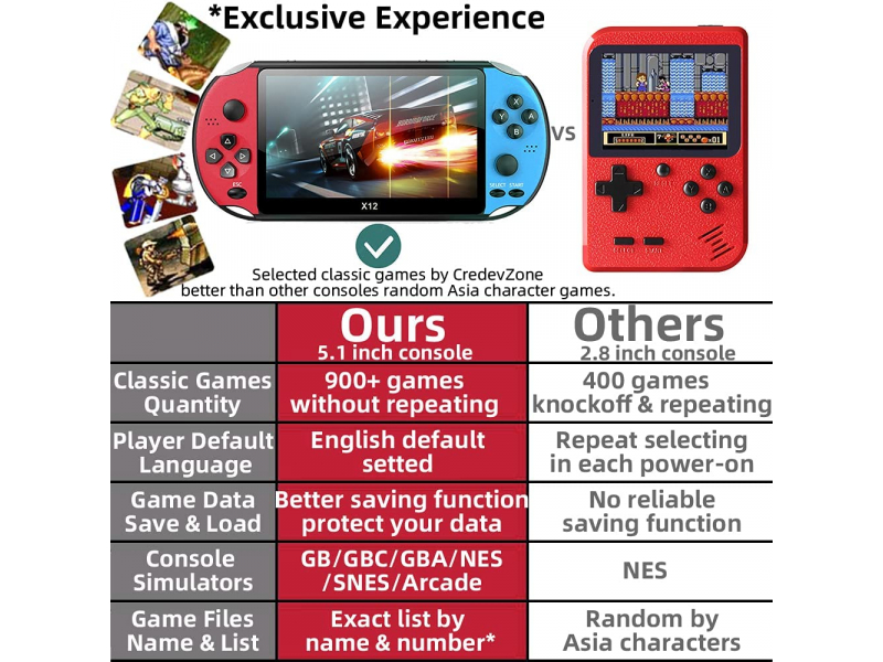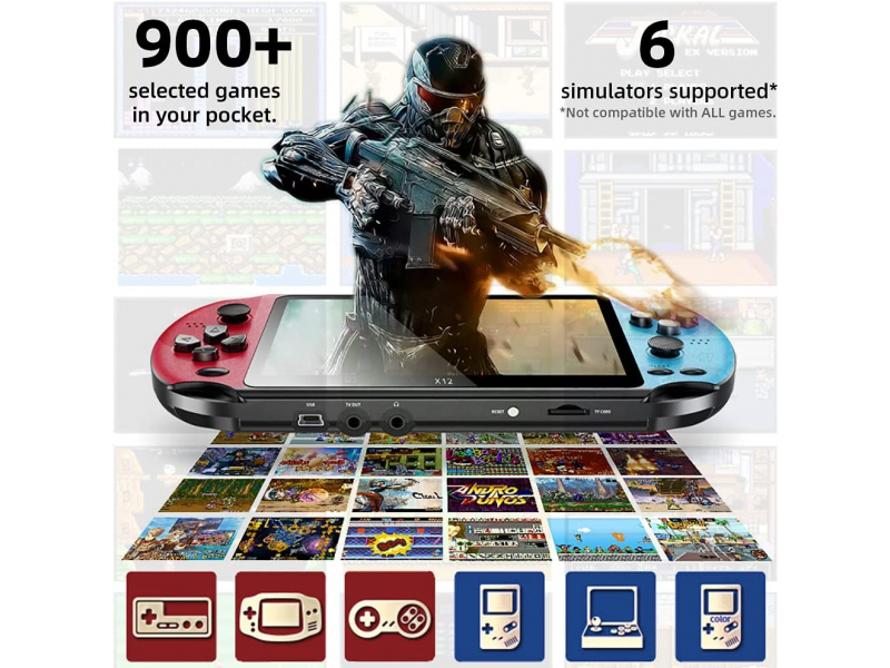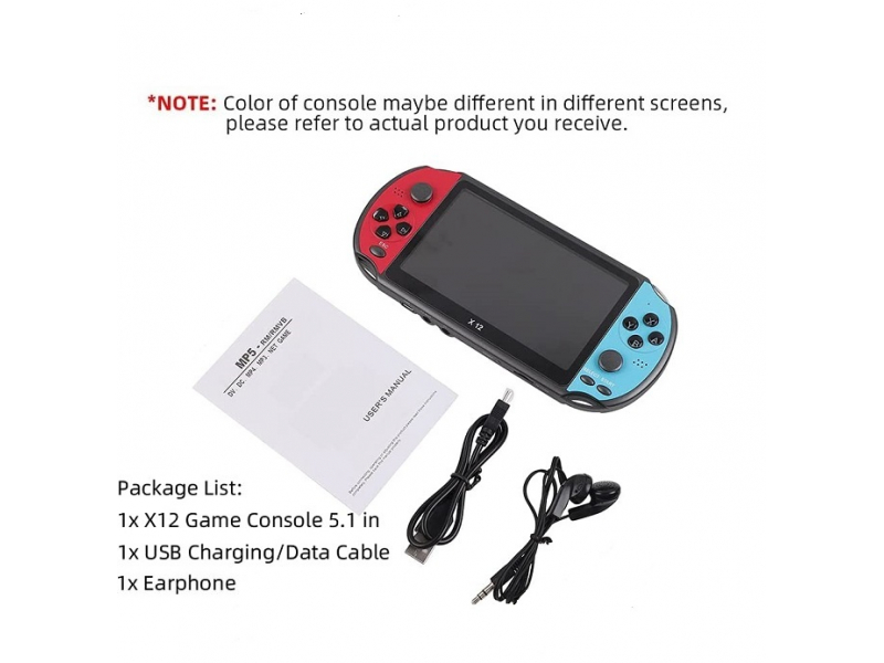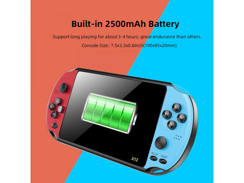 X12 rokas spēļu konsole ir izstrādāta ar 5,1 collu lielu pilnkrāsu TFT LCD ekrānu ar 16:9 displeja attiecību. Divkārša aizsardzība TV spēlētājiem ar pretskrāpējumiem un pretnokrišanu funkcijām, kas sniedz aizraujošu spēļu pieredzi un labāku acu aizsardzību.
