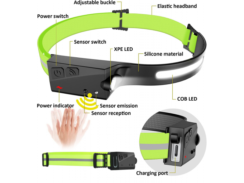Augstas kvalitātes uzlādējams LED priekšējais lukturis, kas paredzēts vieglam un parocīgam, palīdzot mazināt spiedienu uz galvu. Izmantojot kustības sensora režīmu, varat viegli kontrolēt apgaismojuma režīmu, pārvietojot roku skriešanas, kempinga, pārgājienu, makšķerēšanas, riteņbraukšanas un citu āra aktivitāšu laikā.