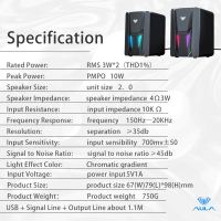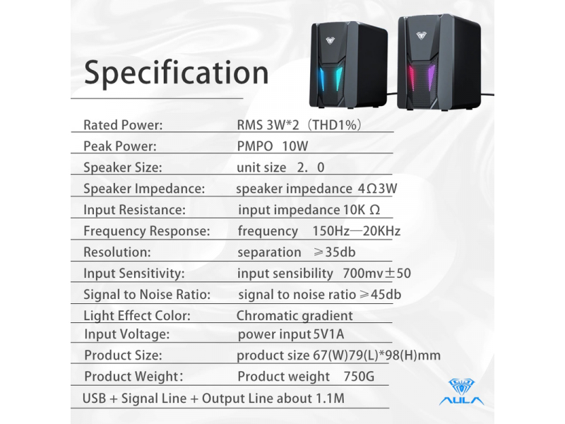 AULA N-108 ir kompakti 2.0 skaļruņi kas pieslēdzami pie datora, portatīvā datora, kā arī jebkuras citas ierīces kas izmanto 3.5mm audio jack pieslēgumu. Šiem skaļruņiem ir 10W skaļruņi, kas nodrošina pietiekami jaudīgu skanējumu priekš ikdienas datora lietošanas prasībām, un lieliski noder arī kā poratīvā datora skaļruņi. Šiem skaļruņiem uz vada ir skaļuma regulātors, kas atvieglo to vadību. Šiem skaļruņiem ir RGB led apgaismojums ko nodrošian USB vada barošanas pieslēgums.