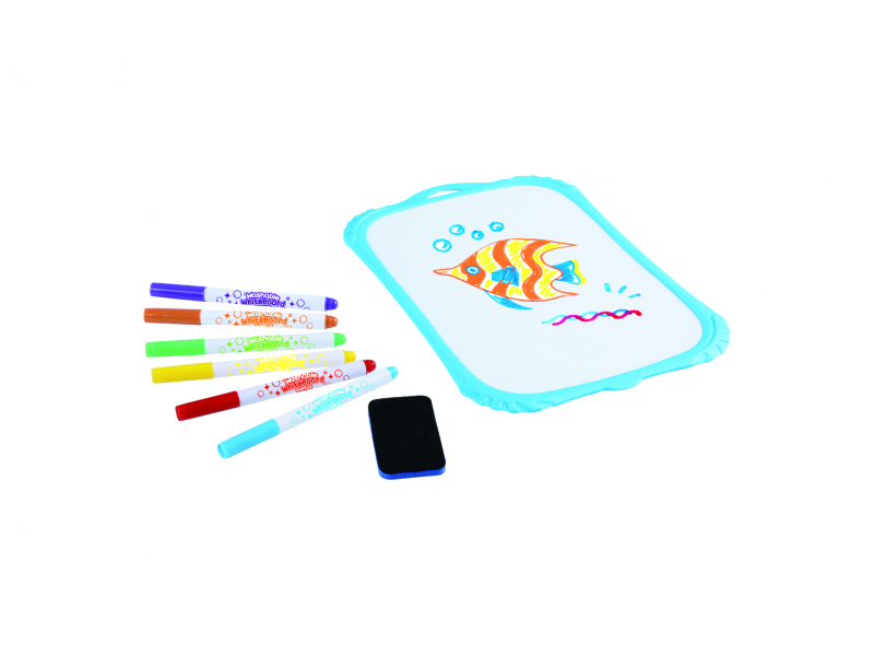 Izstrādāta, domājot par ērtībām un izturību, šī tāfele ir aprīkota ar īpašu ūdensizturīgu virsmu, kas nodrošina, ka jūsu ieraksti paliek neskarti pat saskares ar mitrumu gadījumā. Abpusējā konstrukcija dubulto pieejamo rakstīšanas laukumu, savukārt izturīgais plastikāta rāmis nodrošina stabilu atbalstu. Komplektā iekļauti seši spilgti marķieri, kas ļauj pievienot krāsu un radošumu jūsu ziņojumiem un zīmējumiem.