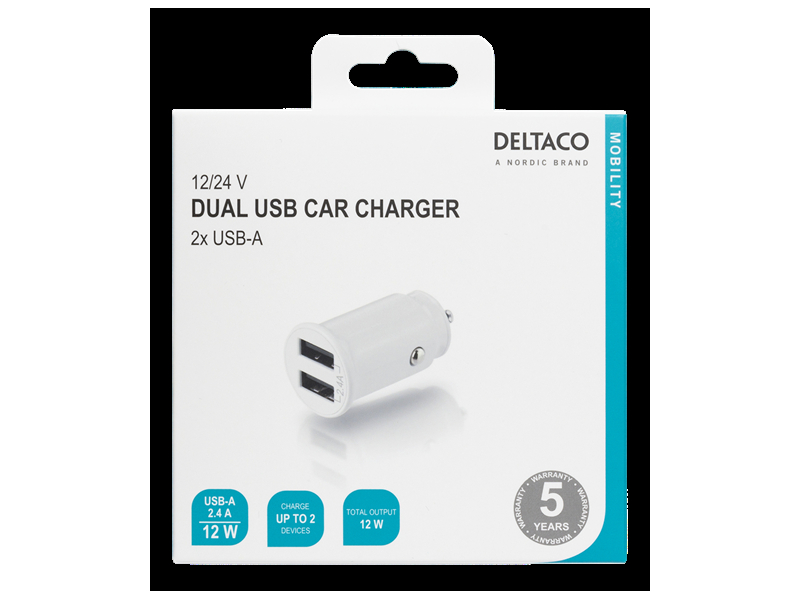 DELTACO 12/24 V USB auto lādētājs ar kompaktiem izmēriem un dubultām USB-A pieslēgvietām, 2.4 A, 12 W, white