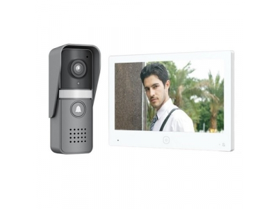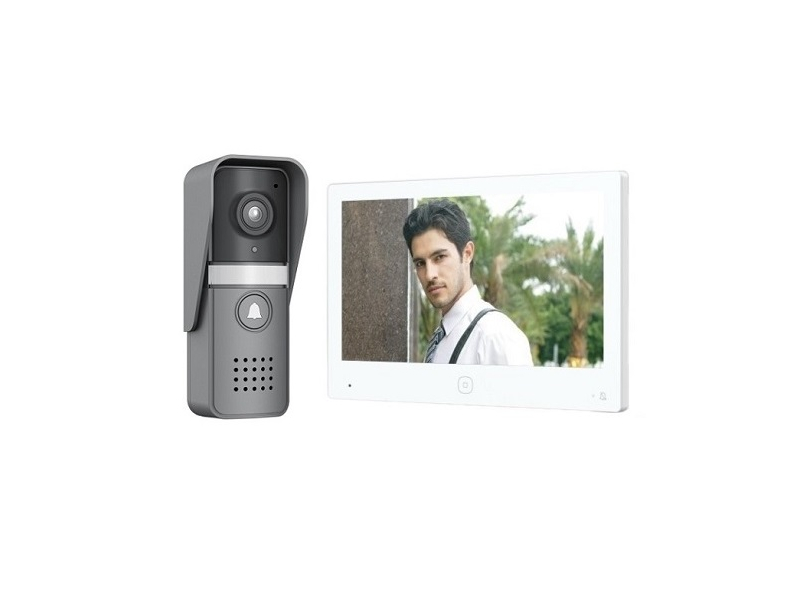 Komplektā ietilpst āra bloks (durvju zvanu krāsu kamera 1080p, 110° pārklājums, ar IR nakts redzamības ierīci, IP55, divu vadu savienojums) un iekštelpu bloks (RGB monitors ar LCD skārienekrāna 7 collu diagonāli, 1024x600 izšķirtspēju, baltu krāsu, Wi-Fi) gt;