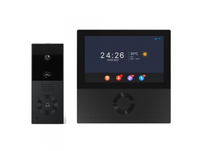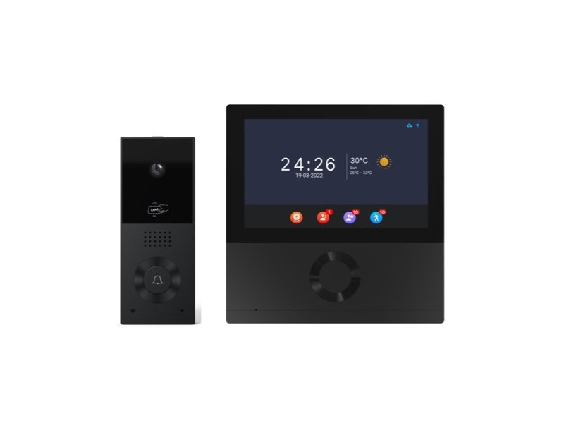 Komplektā ietilpst krāsu durvju stacijas kamera (2MP izšķirtspēja, 120° skata lauks, IR nakts redze, AI kustību detektēšana, IP65-rindota izmantošanai ārpus telpām, 2-vadu pieslēgums) un 7 collu krāsains LCD touch monitors (1024x600 izšķirtspēja, melna apdare, ar Wi-Fi). Durvju atbloķēšana tiek atbalstīta ar RFID kartēm. POZĪCIJU.