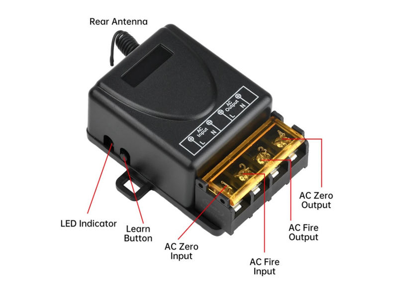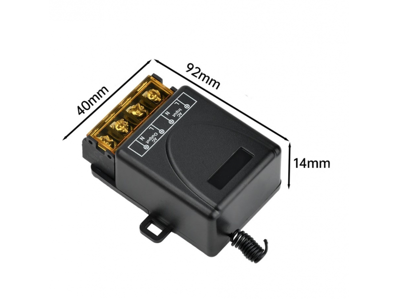 220 voltu releja modulis ar 433 MHz tālvadības pulti, kura darbības rādiuss ir līdz 500 metriem. Relejs atrodas aizsargapvalkā, korpusam ir 4 spailes vadu ieejai un izejai. Pultī ir ievietota baterija. Izmantojot tālvadības pulti, releju var attālināti ieslēgt un izslēgt. Relejs kontrolē maiņstrāvu, nav nepieciešams atsevišķs barošanas avots. Maiņspriegums ieejā un izejā.
