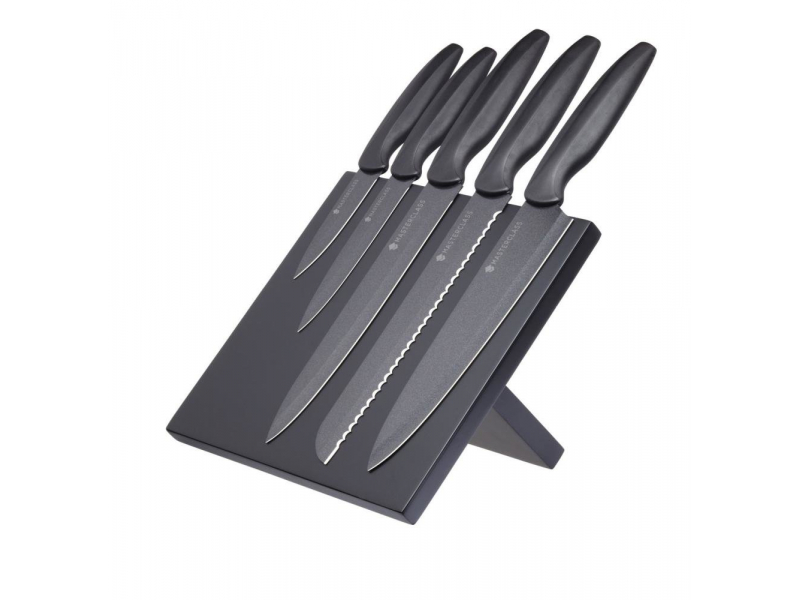 The striking six-piece Agudo knife set is beautifully modern and so, so stylish. But it’s not all about looks – the five knives are made of premium Stainless Steal for outstanding durability and long-lasting sharpness. With its beautiful magnetic storage stand, it’s the perfect presentation piece for your kitchen. It makes a great gift for new movers, or a quick and easy way to replace dull, worn knives. The set includes a 20 cm (8”) chef’s knife, 20 cm carving knife, 20 cm bread knife, 12.5 cm (5”) utility knife and a 9 cm (3½”) paring knife. Long-Lasting Sharpness – Guaranteed! The MasterClass Agudo knives feature high-quality Stainless Steal blades with a non-stick coating. The Stainless Steal ensures durability and long-lasting sharpness, while the non-stick finish means your knives glide effortlessly through ingredients. The knives are designed to last for years, and come with the MasterClass 25 year guarantee. Designed for Comfort and Convenience Each knife has a contoured, soft-grip handle for safe and comfortable use, and maximum control. You can easily slice, cut and dice your way through all sorts of meats, fruits, vegetables and breads. The knives sit on the magnetic board at an angle, for quick and easy access. The magnetic board also folds away for easy storage. Useful Information — Knives are dishwasher safe (handwashing recommended for first 12 months) — Magnetic rack is wipe-clean only — Comes with the MasterClass 25 year guarantee More Cutting Tools by MasterClass The Agudo knife set is part of a wide range of knives and accessories from the premium MasterClass collection. To keep your knives super sharp and preserve their precision cutting capabilities, why not pair this set with the MasterClass Sharpening Steel? Dimensions: 22.5 x 34.0 x 6.5cmProduct Weight in KG: 1.482Product Weight in KG (Including Packaging): 1.790Colour: BlackMaterial: Stainless Steel25 year guarantee