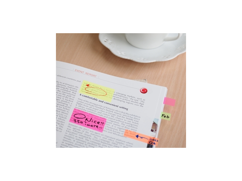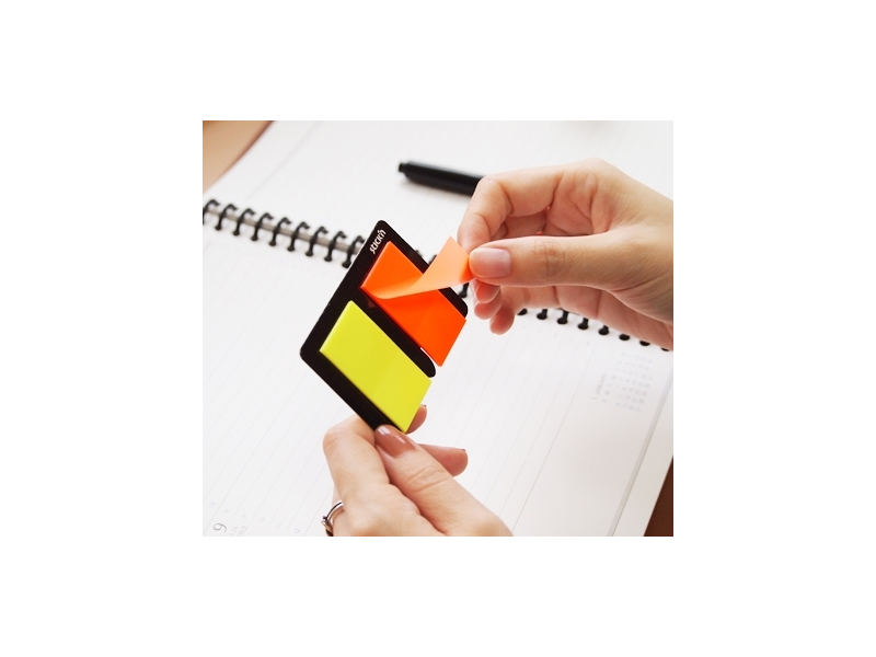 Katras līmlapiņas izmērs ir 45 x 25 mm, nodrošinot pietiekami daudz vietas īsām piezīmēm vai apzīmējumiem, nepalielinot lieku apjomu. Izgatavotas no izturīgas plastmasas, tās ir noturīgas pret nodilumu un neplīsīs nepiemērotā brīdī. Komplektā ir 25 spilgti oranžas un 25 piesātinātas dzeltenas līmlapiņas, kas ļauj efektīvi izmantot krāsu kodēšanu dažādām tēmām vai kategorijām.