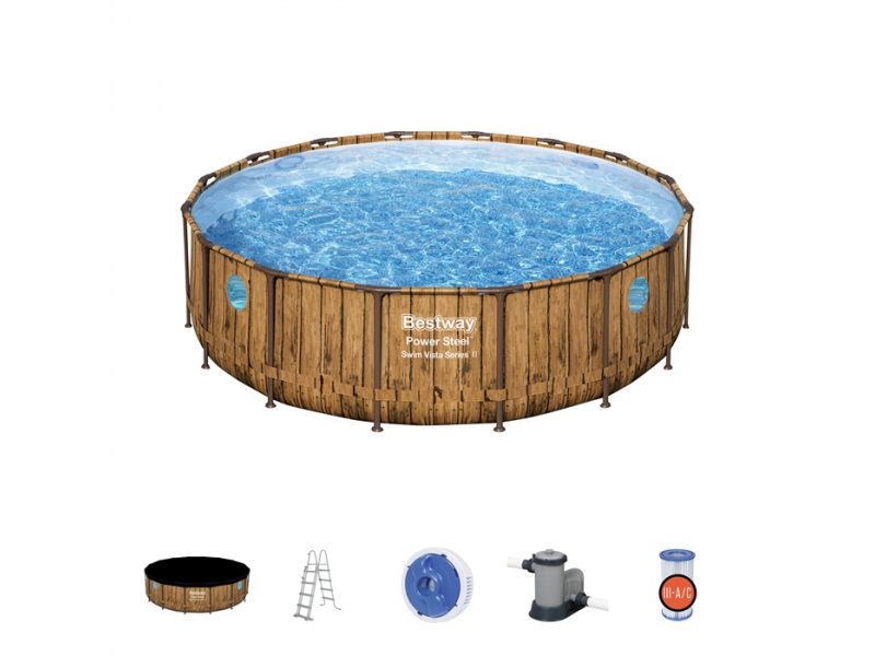 Komplektā: viens baseins, filtra sūknis, kāpnes, baseina pārsegs, ChemConnect™ dozators, remonta ielāps