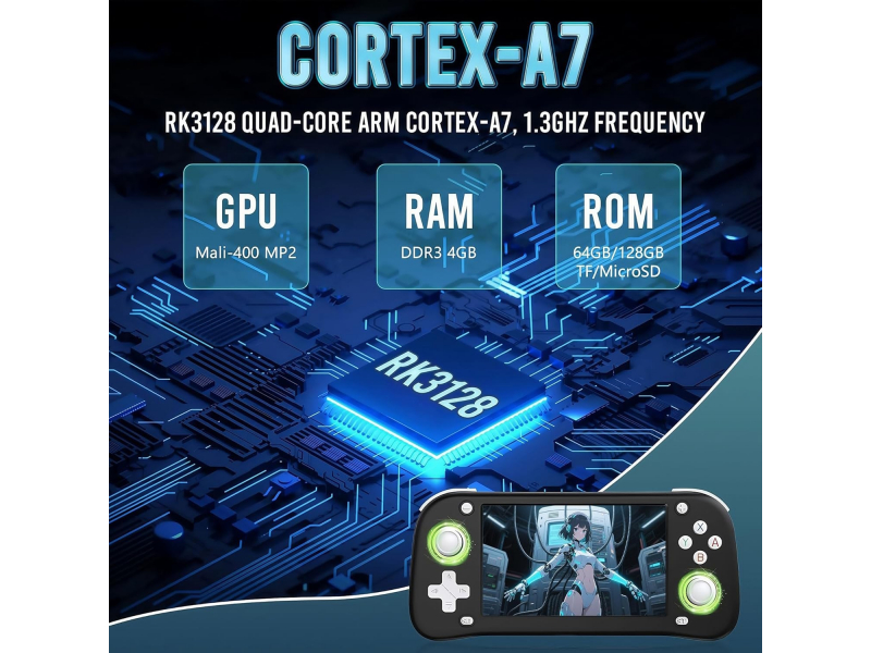 - CPU: RK3128 Cortex-A7 1,3 GHz