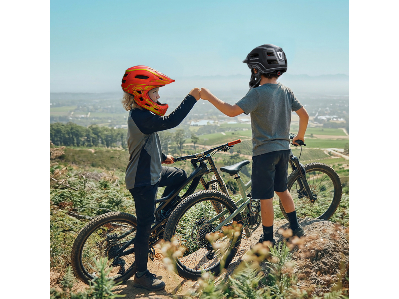 Pateicoties izturīgajam sejas dizainam, ķivere garantē pilnīgu sejas un žokļu aizsardzību un papildus aizsargā seju no saules, lietus un putekļiem. Turklāt integrēta LED gaisma uzlabo bērnu amplitūdu;#39;s redzamība naktī un vājā apgaismojumā.