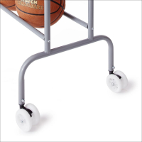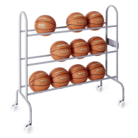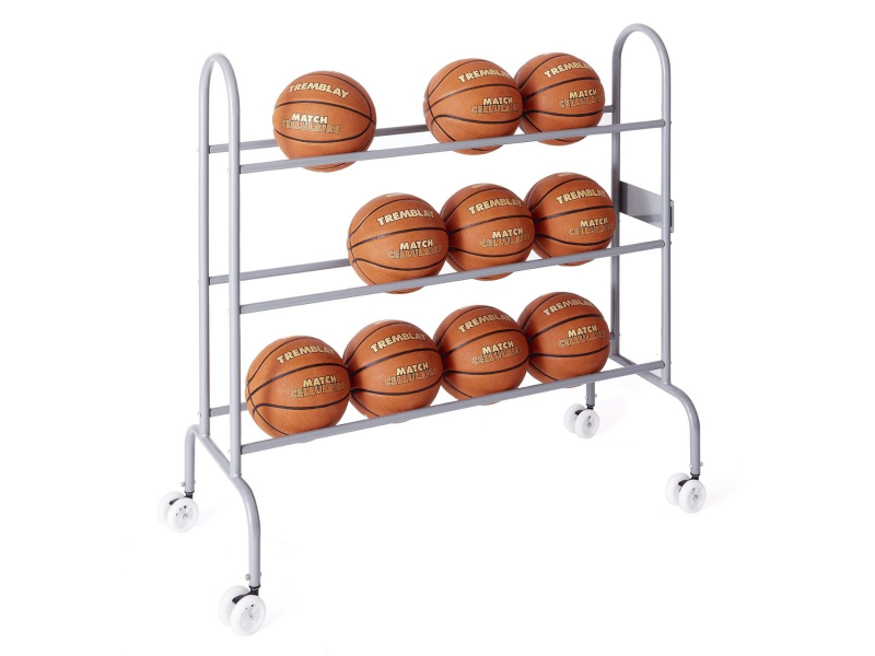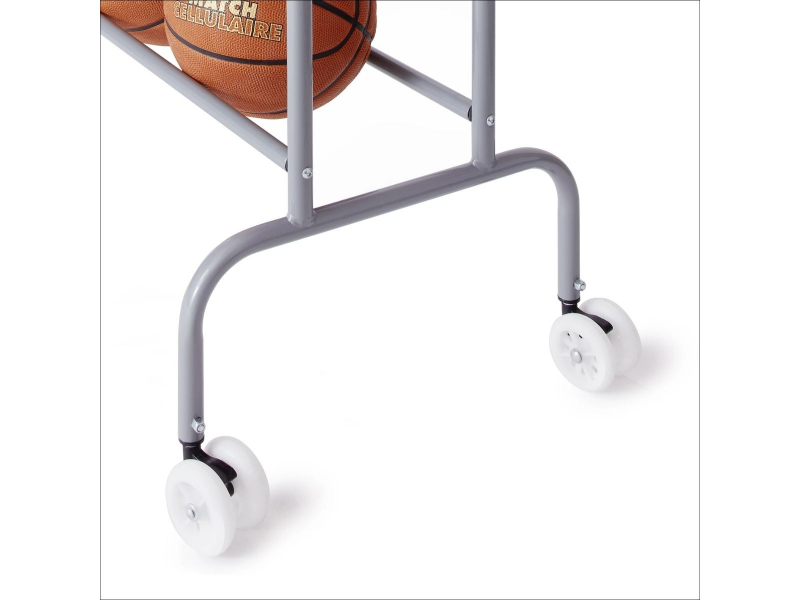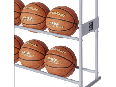 Uzglabāšanas plaukts bumbiņām. ar 4 rotējošiem riteņiem. ļauj uzglabāt līdz 12 bumbiņas izmērs 5 vai 7. izmēri : 105 x 43 x 105 cm.