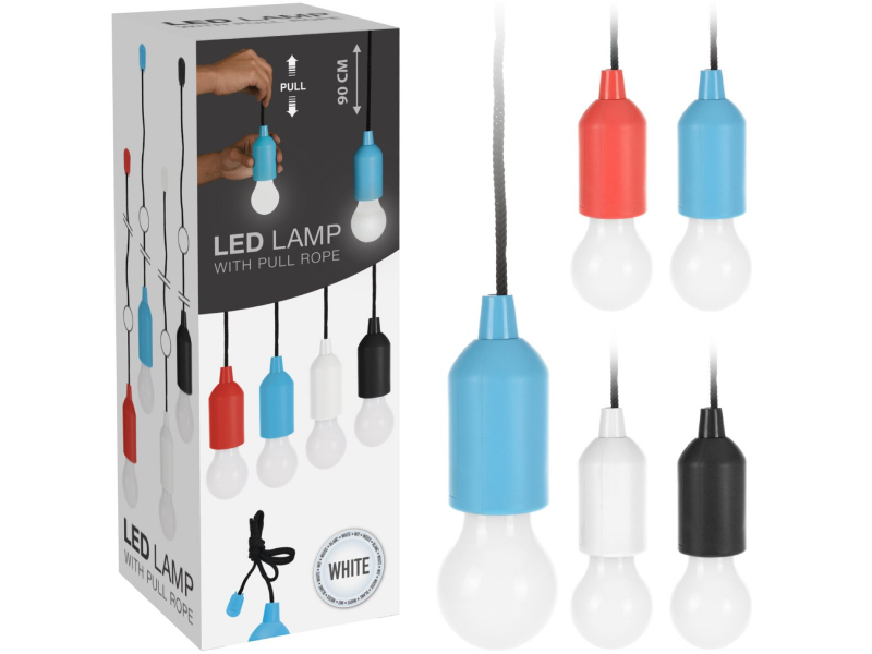Lampa ar stieples slēdzi, gaismu var viegli ieslēgt vai izslēgt, pavelkot aiz auklas. Gaismas avots ir integrēts LED. Izgatavota no ABS plastmasas. Darbojas ar 3 x AAA baterijām (nav iekļautas komplektā). Izmērs (D x A) 5 x 15 cm, kopējais garums 90 cm.